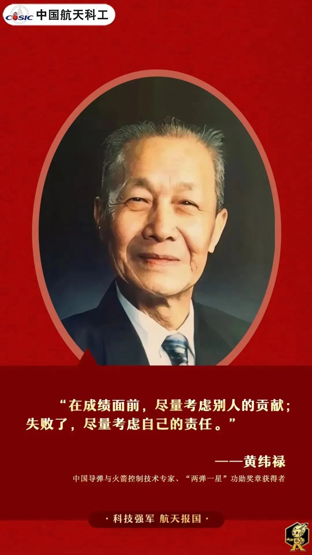 1999918日,在新中國成立50周年前夕,黨中央、國務院、中央軍委隆重表彰為我國“兩彈一星”事業作出突出貢獻的23位科技專家,并授予他們“兩彈一星功勛獎章”。黃緯祿便是其中之一。
